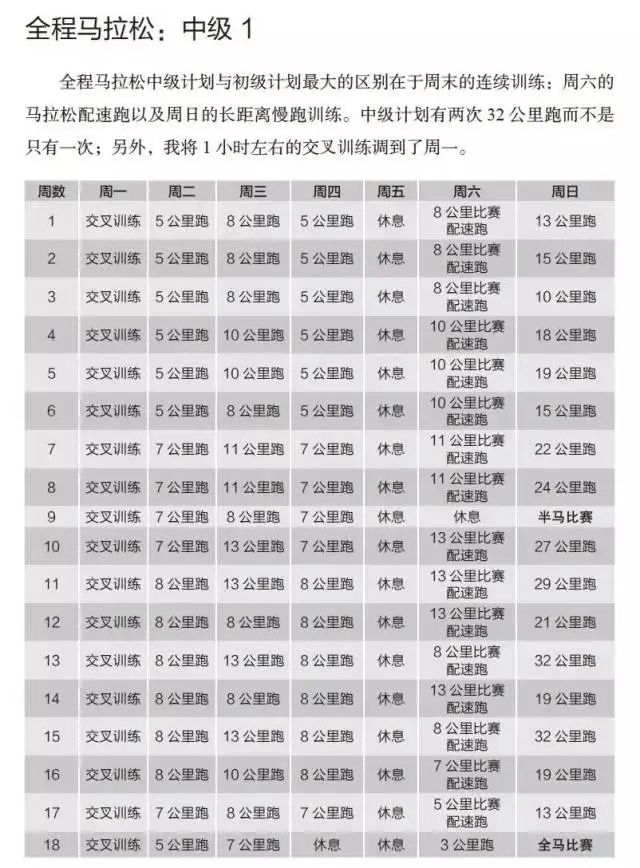 这是最流行的训练计划,其关键部分在于周六的长距离跑。从第一周是10公里跑,逐渐发展到第15周的32公里,随后开始为准备全马比赛而减量。