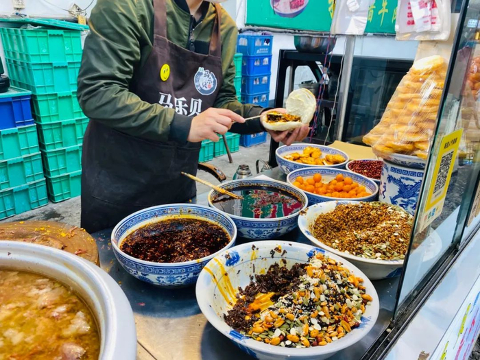 洒金桥的美食与回民街和永兴坊同样出名,于是我们把临近比赛前的碳水储备安排在了这里,这里比起另两处,更加市井、更接地气,来往的人群中游客似乎要少于当地的市民,而这里的美食也同样别具特色,肉丸胡辣汤、牛肉饼、玫瑰膏都各具美味,我们只恨自己没能拥有一个大胃,不能一下吃的尽兴。