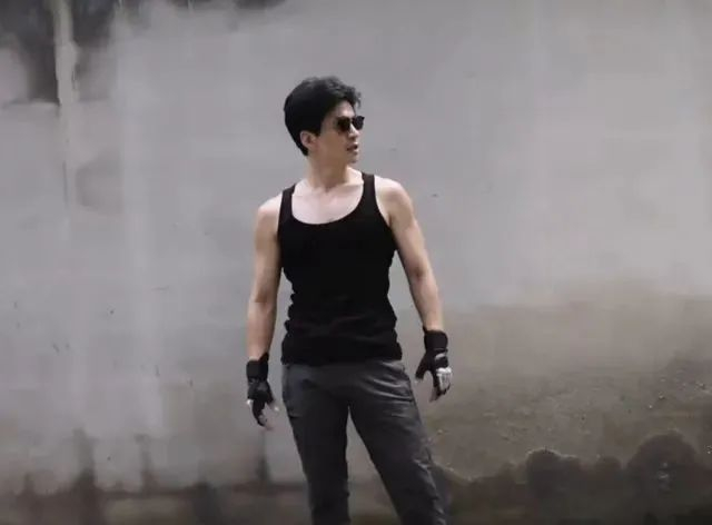戴着墨镜、身穿运动背心,明显的肌肉线条,这也太硬汉了。(十四默默低下头看了一眼被麻辣烫烧烤零食浇灌的肚子)