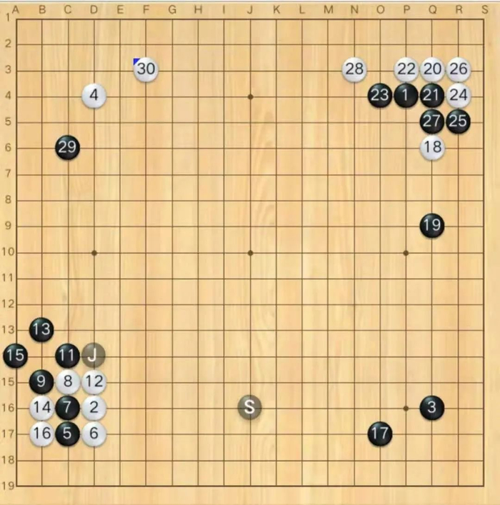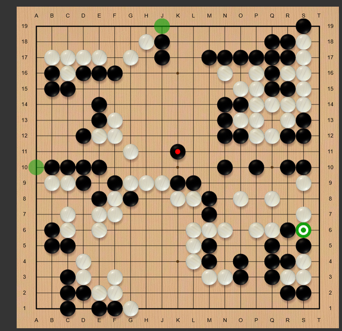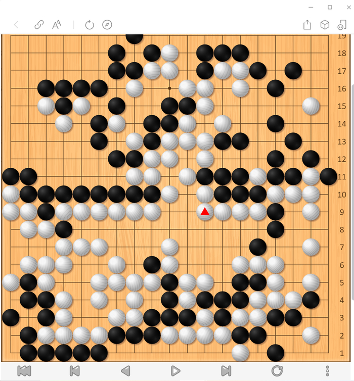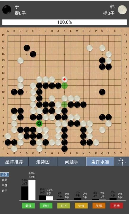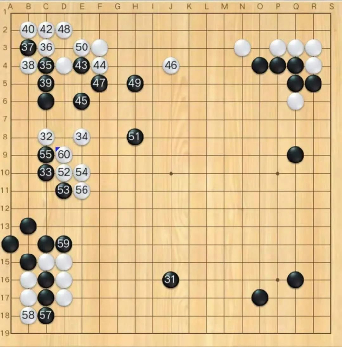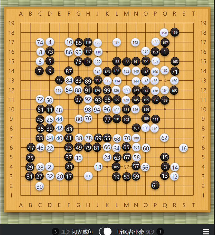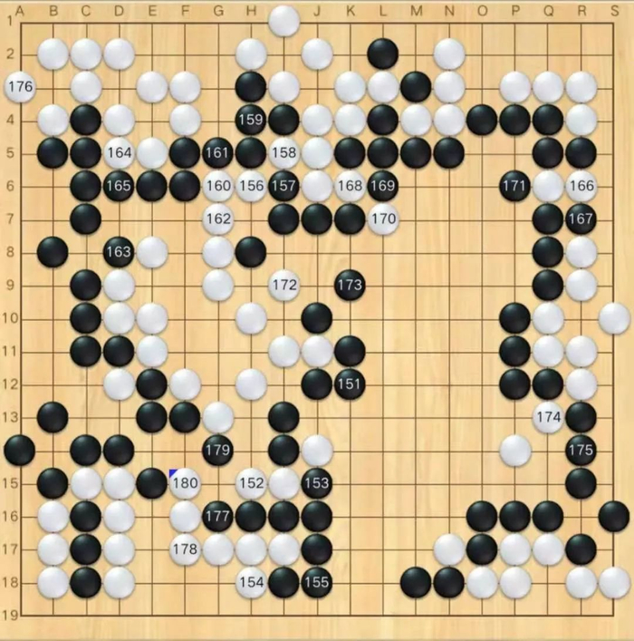 布局阶段左下角黑29可能应该走54位置,实战被白32长到角上,黑棋形状已经不太对了。33点入之后这一串感觉黑棋又亏了,白走到56的时候,黑棋形势已经不乐观了。白70可能于f17位守角更加实惠,实战白棋被黑棋活了一个大角,明显亏损,局后看星阵分析白80可以走b17立下杀黑,但手法过于高端,对局过程中双方都没发现这个手段。在上方的战斗中,黑方出现错觉,没注意到白126挖断是先手,但好在黑方形状比较有弹性,白棋也很难把黑攻得太惨。白166可能应于167位打入,这样局势还乱一些。最后的战斗在右上角,局后根据星阵的分析,白170走在172位,角部的相关变化还有些复杂,可能会形成一个缓气劫。实战黑棋在右上角简单处理后,抢到r4的守角,白空已经明显不足。