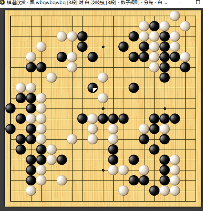 开局黑棋顺风顺水,局势一片大好,在上方围住巨空的同时掏掉下方白空,可是此后黑棋出现误算,中间六子棋筋被吃,此时局面已经失控。此后黑棋未能及时冷静下来,再次误算下方黑角死活,最终惨遭逆转。