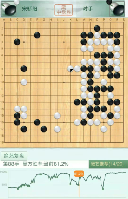本局黑棋表现中规中矩,没有出彩的手筋,但对于白棋几个问题手处理得当,屡屡获利,胜率一直在很稳定地上升,没有给任何翻盘的机会。