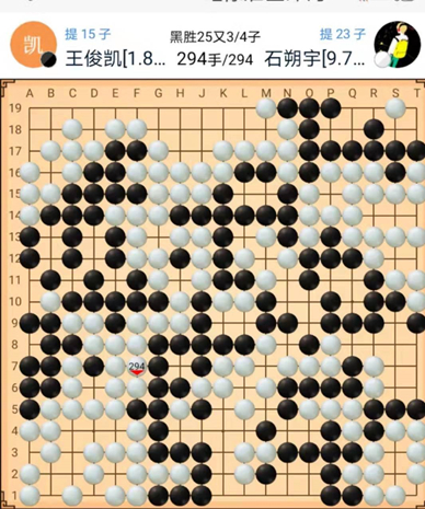 第二台是客队的王俊凯执黑对阵主队的石朔宇。这一盘双方在开局时就在左下方展开战斗,引发了劫争,由于客队选手王俊凯找不到合适的劫财,主队选手石朔宇果断消劫后稍稍占优。然而到了中盘阶段,白棋打入右下角黑空的手段有些欠考虑,在黑棋的精确计算下,白棋大龙被全歼,形势也瞬间颠倒。官子阶段黑棋滴水不漏,稳稳地拿下了这局比赛的胜利。