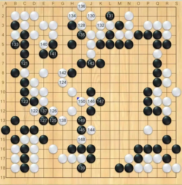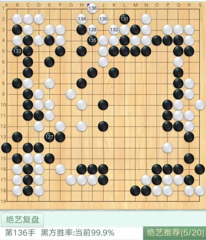 黑133,贪,被白抢到134位,亏损。但此时白棋已经大差,又被黑棋抢到J7位补棋,中腹主空铁厚,胜负已无悬念。