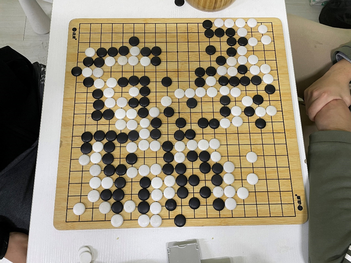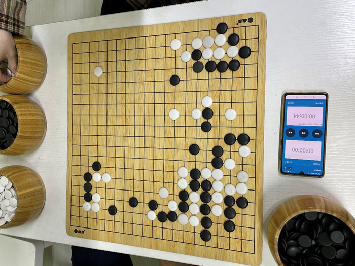 比赛于早上10点准时开始,第三台是主队的刘潇楸执白对阵客队的金双。这一盘双方在布局期间稳扎稳打,然而在下方的战斗中客队选手出现了失误,将角地的实地让给了白棋。之后客队选手为了挽回局面只得全力攻杀下方白子,但由于主队选手刘潇楸处理得当,很快将孤棋做活。客队选手见棋盘上已无争胜之处,遂果断认负。