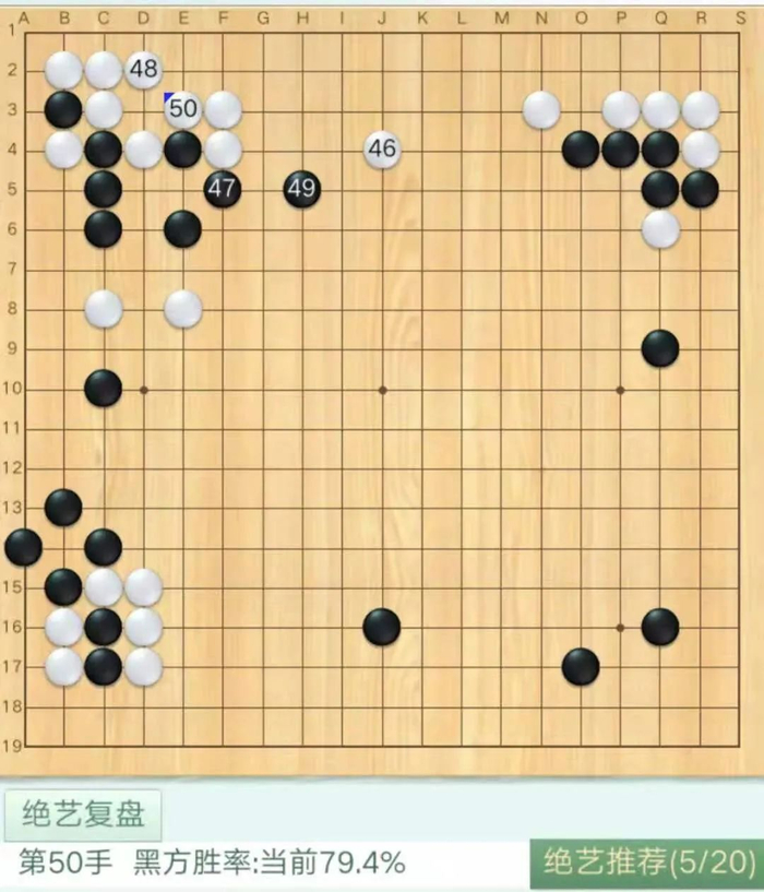 本场第一个问题手出现在白46,绝艺推荐J位尖封锁,之后形成上图所示局面。实战白于边星开拆连片,黑棋顺利出头后对白左侧数子形成反攻。白50缓手,被黑棋抢到H8位镇头,局势生动。