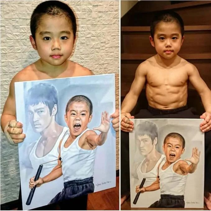 一个小孩能接受如此刻苦的锻炼,练出劲爆的肌肉身材,不是真心热爱是做不到的,背后有偶像的精神支柱,更有他不怕吃苦的韧劲儿!能获得今天这样的成绩,至少他的骨子里,已经拥有了李小龙精神。