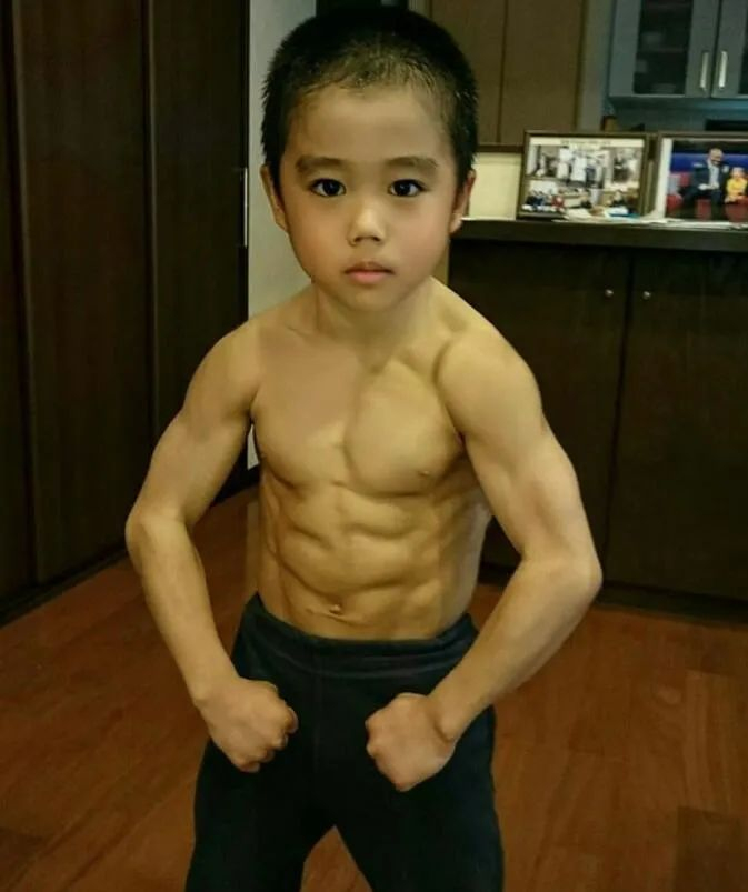 为了向李小龙看齐,他练出了清晰的腹肌和鲨鱼肌,凸起的胸肌,结实的手臂线条。你很难想象眼前这位肌肉炸裂的小小男子汉竟然才这么小,真是让绝大多数成年人都汗颜!
