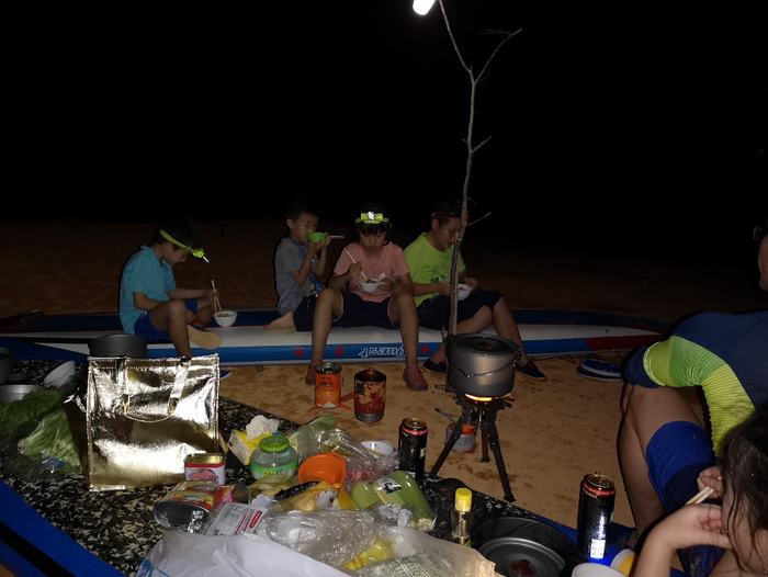 教学5:晚饭后收拾营地,准备好第二天早餐食材和饮用过滤水等一切就绪后,开始桨板夜训,夜间划行规则、划行技巧、注意事项、辨别方向、组队划行、落水互救、桨板救援、突发风浪暴雨中互救避难及抛绳救援等。