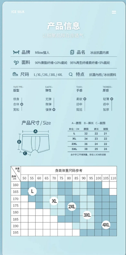 2、亲肤冰丝材质,冰爽触感,透气导湿,拒绝闷热。标准3A级抗菌,抑菌率高达99%!