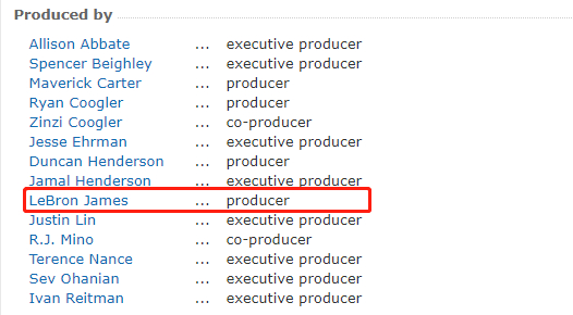 与杜兰特和康利担任EP不同,今年7月将要上映的《空中大灌篮2》中,詹姆斯是主演,也是制片人(Producer)之一。制片人一般不仅拥有拍摄时的基础财产权利,还将作为创作者与监督者,还在拍摄中提供思路、进行管理等。因此,詹姆斯在这部影片中必定参与了很多的生产阶段。
