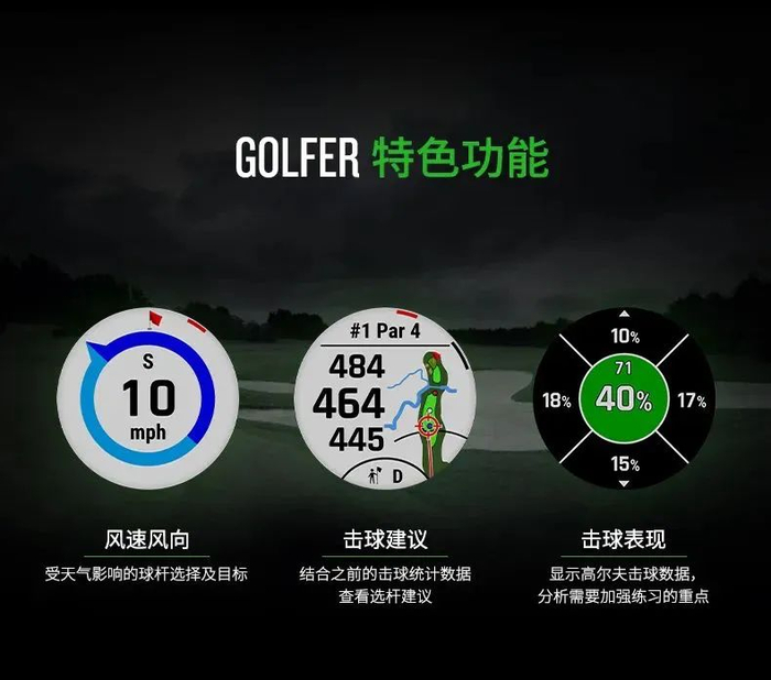 为了减少误触,这款腕表采取完全按键控制的设计,操作简单稳定。除了内置4万1000个海量球场图,帮助快速浏览球道布局和障碍视图外,这款腕表还支持PlaysLike坡度补偿、风速风向、击球建议和表现等功能,可以帮助球手更好的分析和决策,提升打球体验。