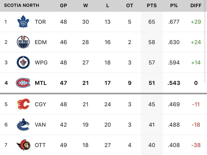 北区形势已经非常明朗,多伦多枫叶已经基本锁定头名位置。唯一的悬念是卡尔加里火焰还存在晋级季后赛的可能。