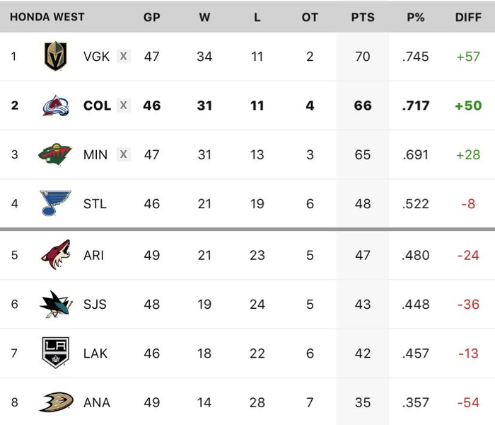 最后的季后赛席位将在圣路易斯蓝调和亚利桑那郊狼之间决出。