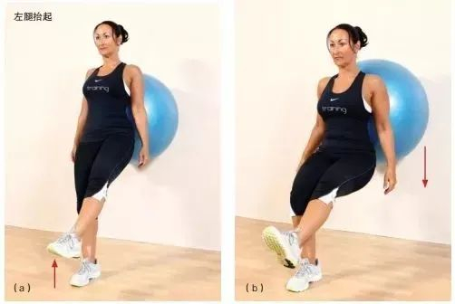1.健身球置于墙壁与下背部之间,使用优势腿单腿站立。