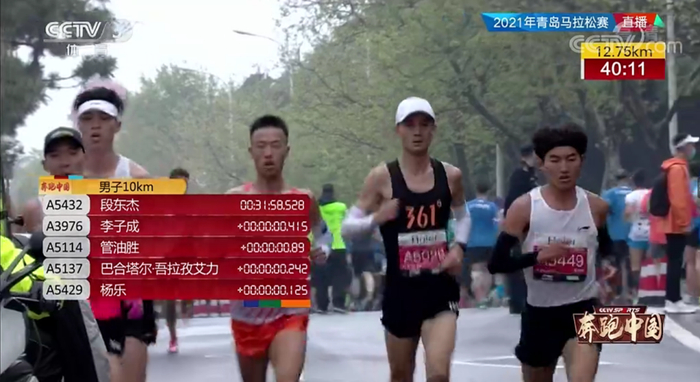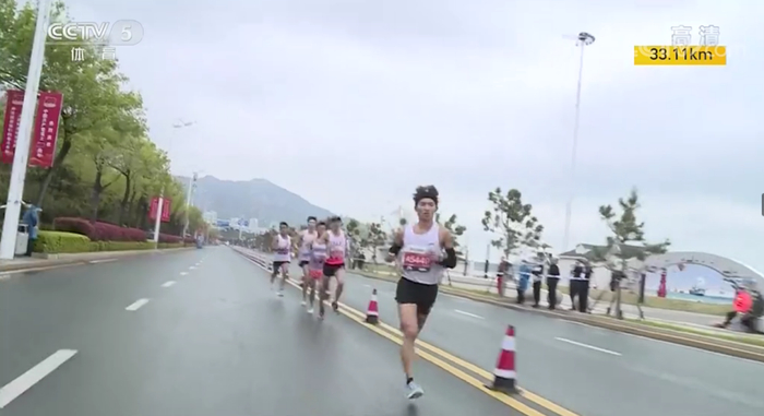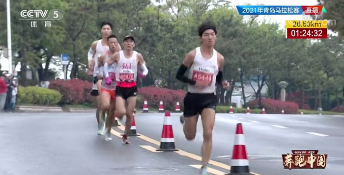 第一集团5人交替领跑,在27公里又开始由李子成领跑。