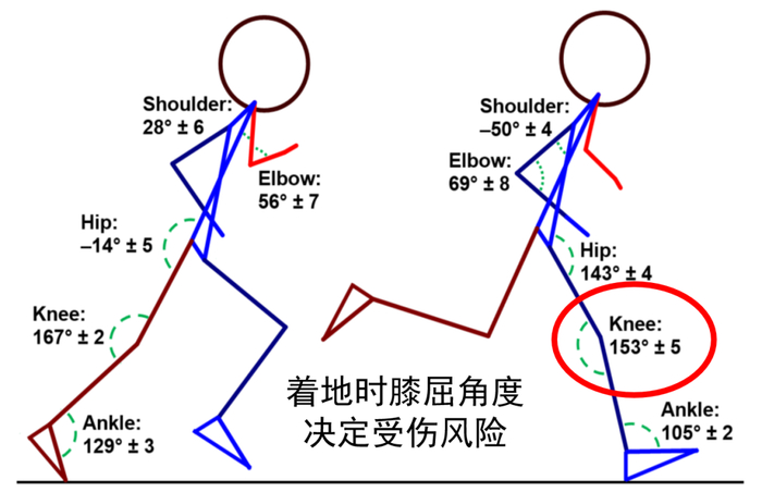 大众跑者着地瞬间膝屈角度明显大于运动员说明大众跑者着地时膝关节伸得更直刹车更明显