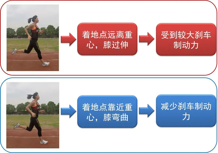 也就是说,着地时身体姿态尤其是下肢位置是决定制动刹车效应的主要因素,如果着地时膝关节伸得过直,着地点距离重心较远,那么这样会导致较大的刹车制动效应,且不利于着地后膝关节积极下压缓冲。