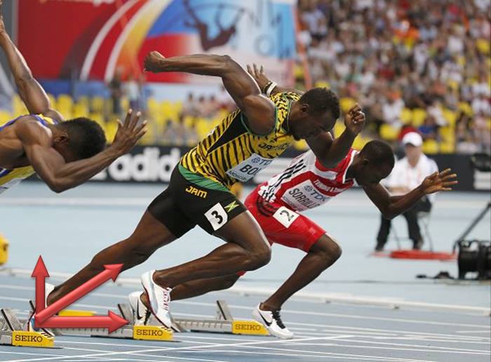 大家都知道,现在短跑都是采用蹲踞式起跑,而不是站立式起跑,其根本目的是在于蹲踞式起跑可以获得更大的水平向前的地面反作用力,而站立式起跑所获得的水平反作用力小得多,这样,通过蹲踞式起跑运动员就能获得更大的初速度和加速能力。