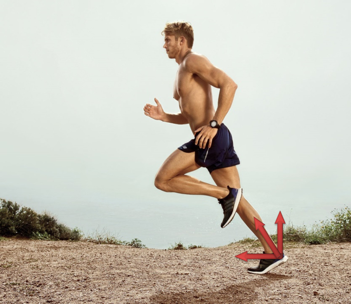 从下面这两个示意图,我们可以清楚地看到,在着地时,由于着地点往往都在重心前方,这时人会给地面一个朝前下方的作用力,当然地面就会给予人体一个向斜后方的反作用力,这个力可以分解为垂直分力和水平分力(水平分力方向与运动方向相反,所以是刹车制动),这就意味着制动刹车,而在蹬地阶段,这个时候水平和垂直分力的合外力朝向前进方向,就变成推进力了。