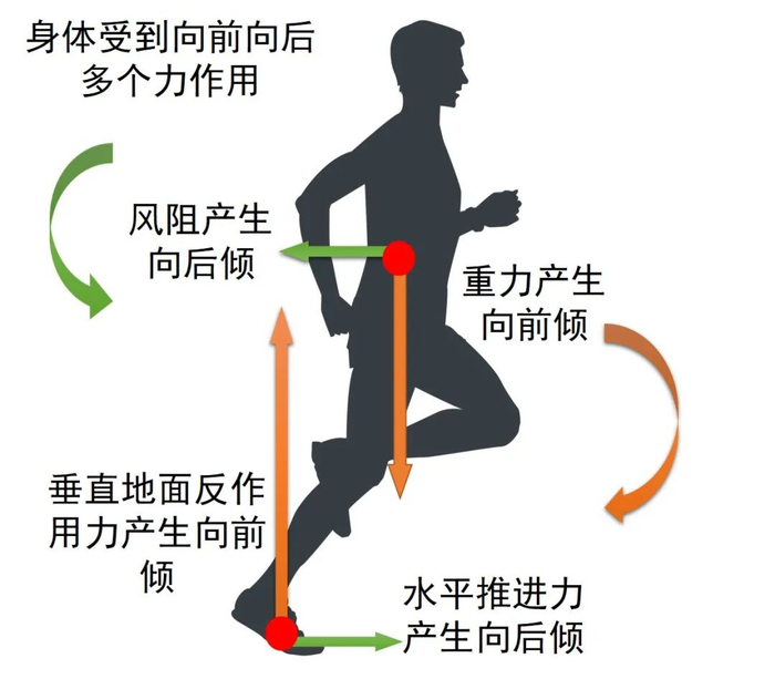 跑步是身体向后转动力矩(水平推进力力矩、空气阻力力矩)与向前转动力矩(垂直地面反作用力力矩、重力矩)相互抵消,使人体保持平衡的结果。如果是因为利用重力而前倾,那么前倾越多,岂不是利用重力越多,但事实上身体前倾越大,重力所产生的以脚为支点的人体向前转动的重力矩就越大,人体为了防止旋转,就不得不拼命用力蹬地,加大水平推进力力矩,来对抗重力矩。
