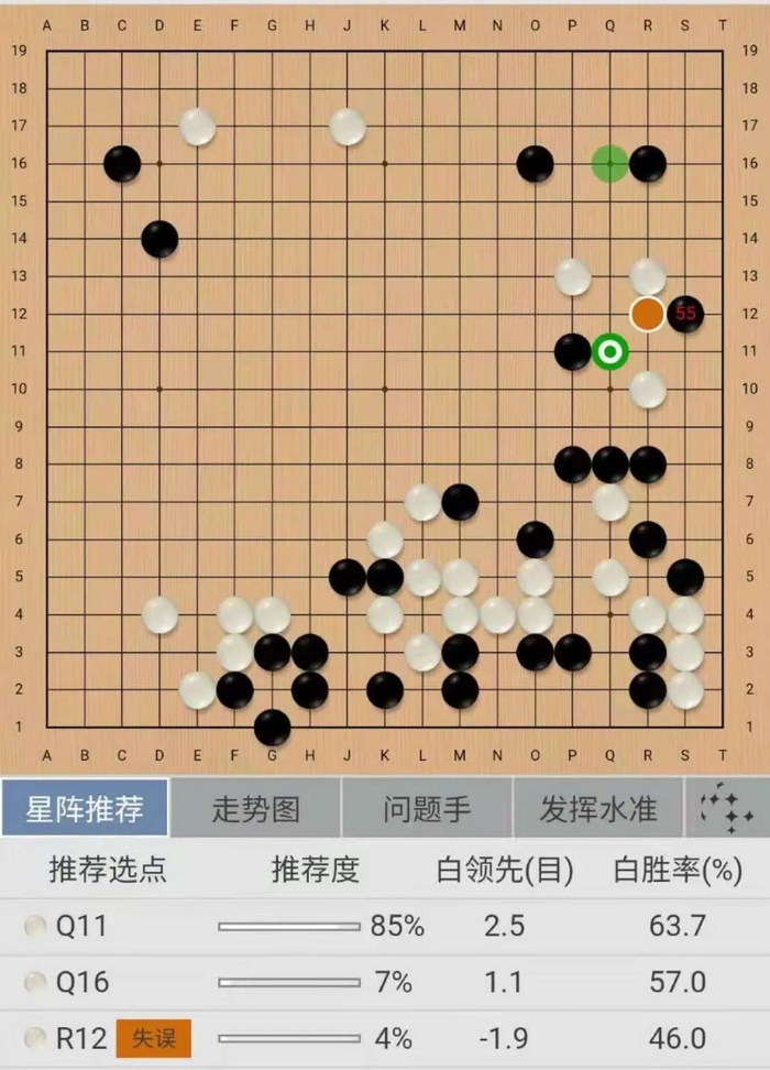 快棋台:开局白20略有问题,局部亏损不少。在左下的战斗中,白棋下法过于强硬鲁莽,走出了一系列重大问题手,反观黑棋踏实稳健,循序渐进。继白54之后全盘已无潜力,无力再战。该局为黑棋完胜。