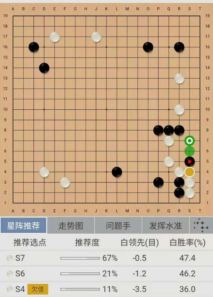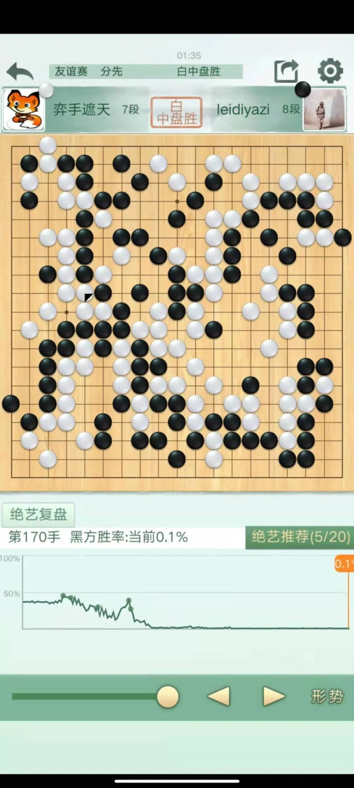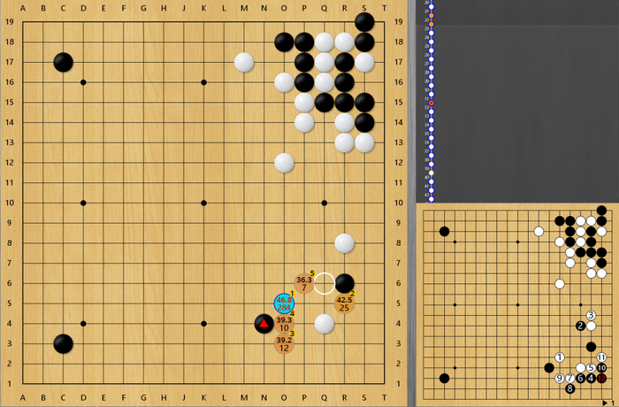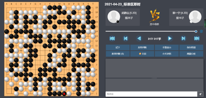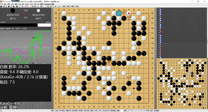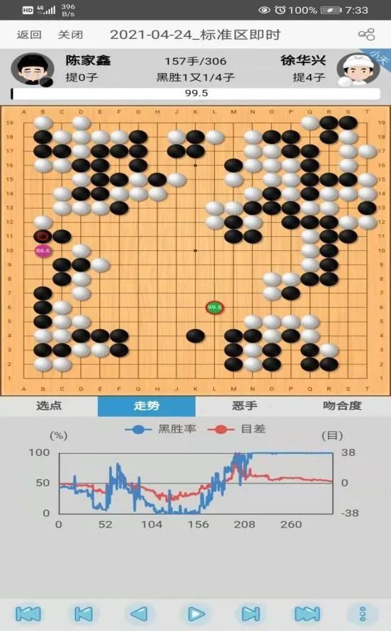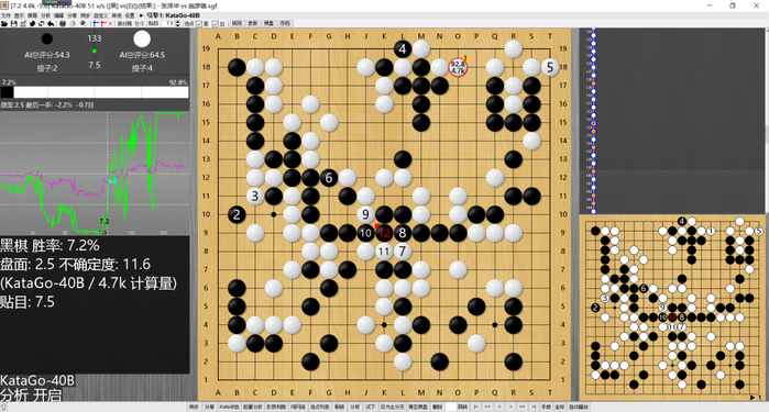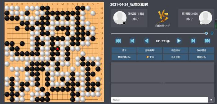 这盘棋双方前期平稳开局,左上战斗后形成黑小优的局面。但随后黑棋87手挖有些随意,实战让白棋走在了外面,行至120手,白棋胜率已达90%以上。随后在读秒阶段,双方错进错出,形成转换,黑棋一度看到了翻盘的希望,但在读秒中黑棋次序有误,错失了最后的胜机,遗憾告负。