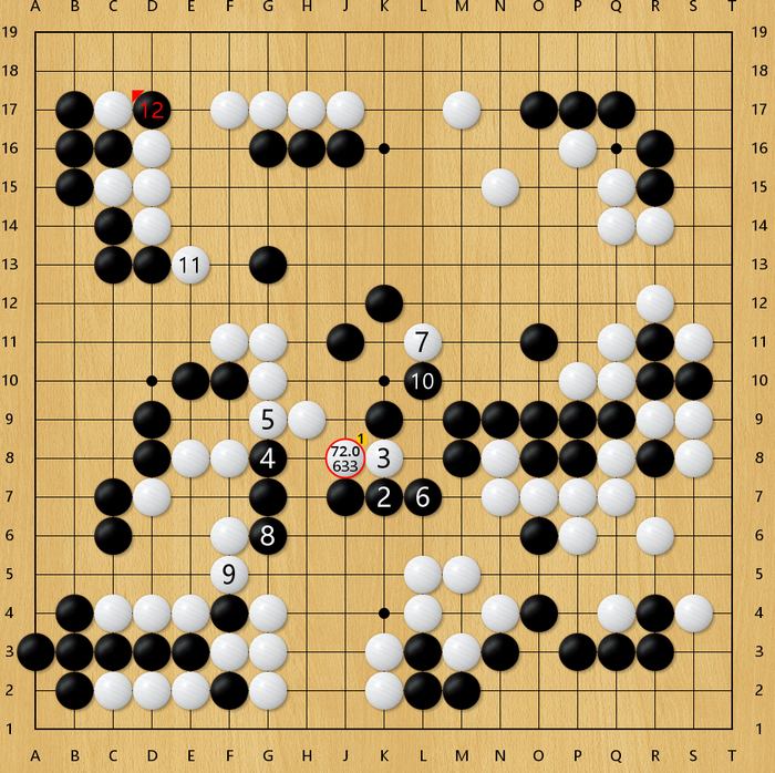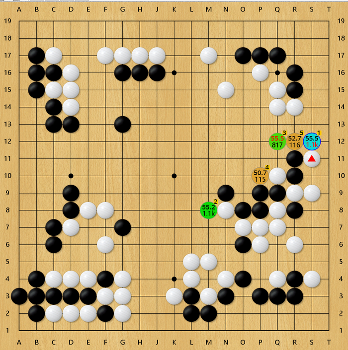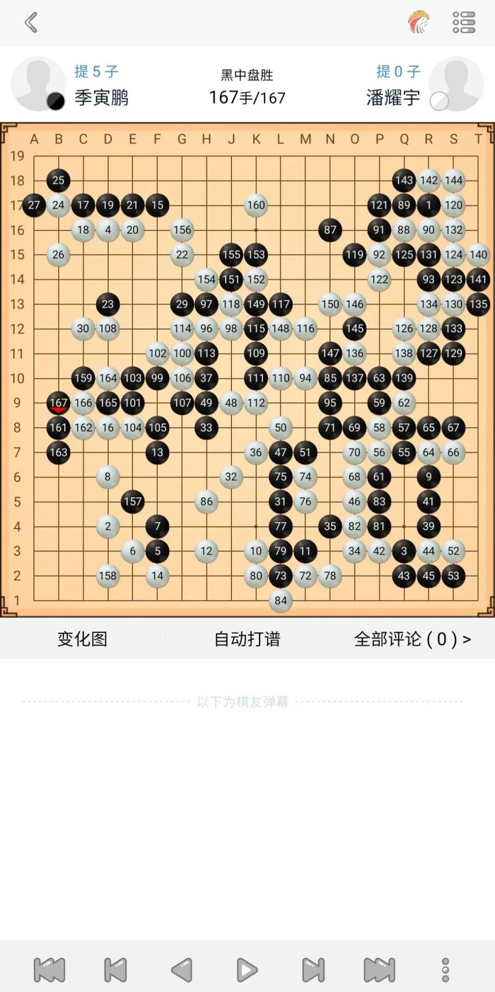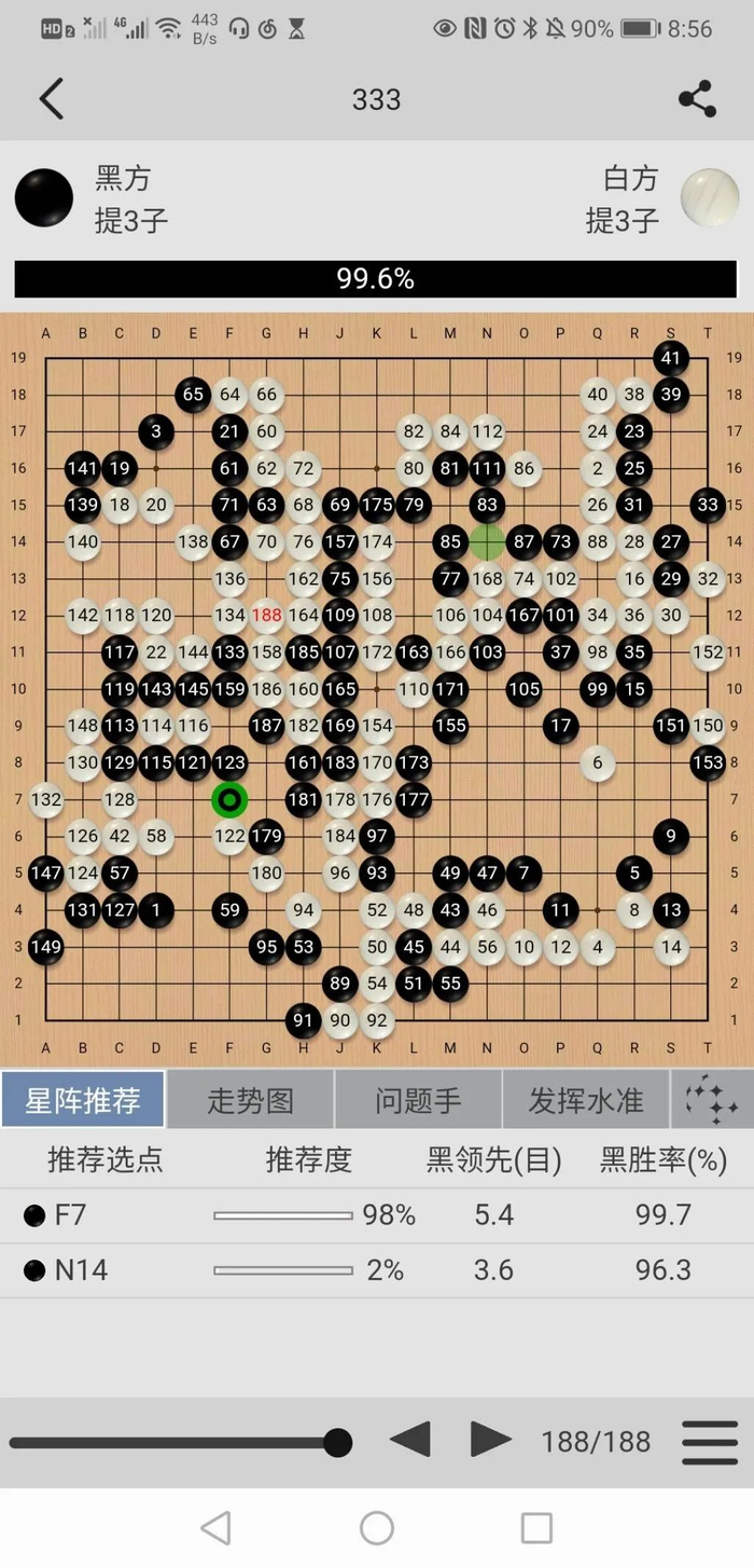 这盘棋双方前期平稳开局,左上战斗后形成黑小优的局面。但随后黑棋87手挖有些随意,实战让白棋走在了外面,行至120手,白棋胜率已达90%以上。随后在读秒阶段,双方错进错出,形成转换,黑棋一度看到了翻盘的希望,但在读秒中黑棋次序有误,错失了最后的胜机,遗憾告负。
