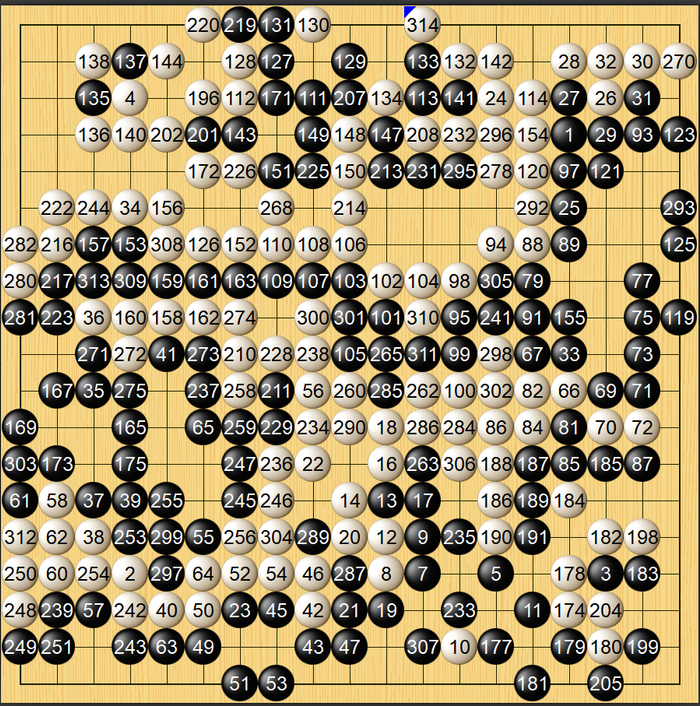 快棋台:序盘白32一路扳随手,失去一路立先手,黑43以下损失实地严重,上方白60碰无礼,随后白82下立过于软弱,AI怒降50胜率。然而中腹黑棋扩张时却忽略白104的好棋,局面瞬间恢复均势。113打入制造混乱,此后在读秒的催促下双方均错进错出,最终黑棋188子获胜。