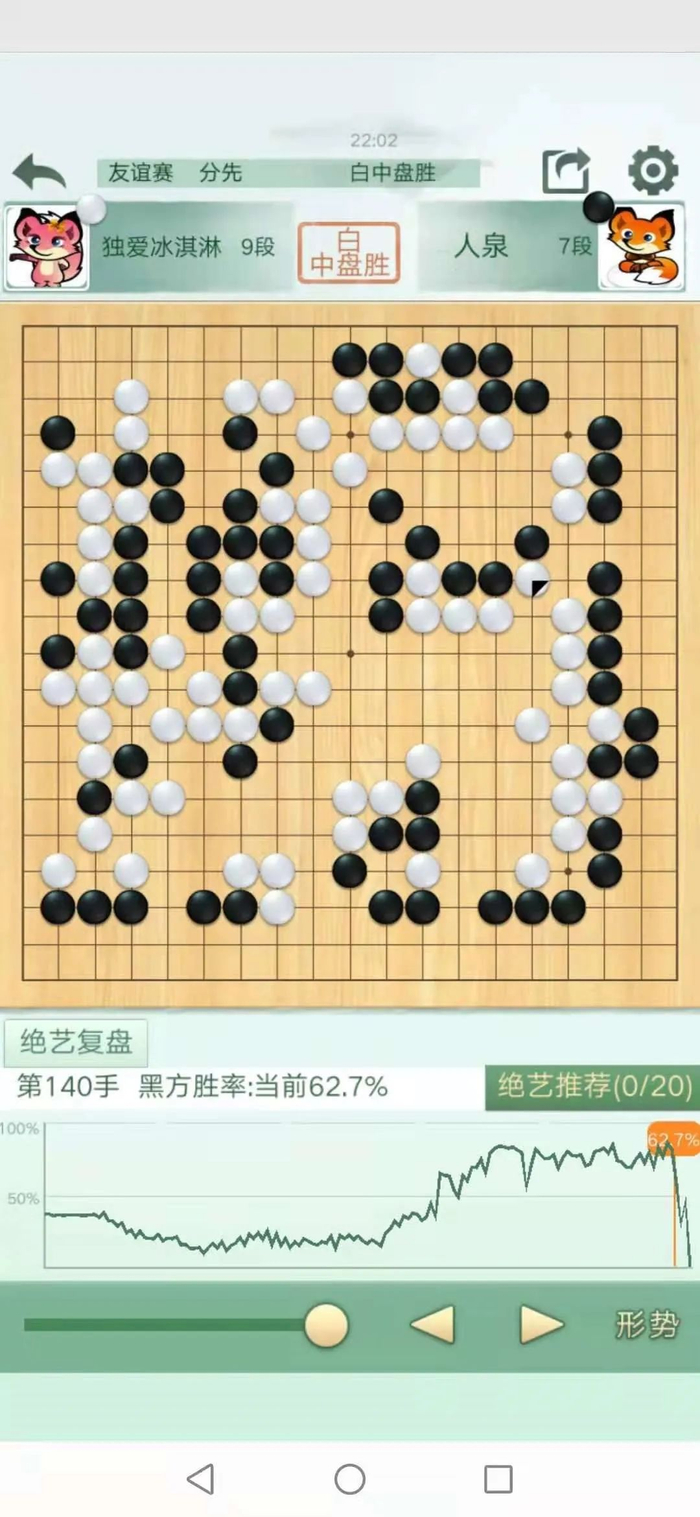 布局阶段黑方速度较快但是没有注意补断,但是在白棋找到机会攻杀后黑棋并没有亏太多,但是在最后白棋侥幸捡勺,侥幸取胜。