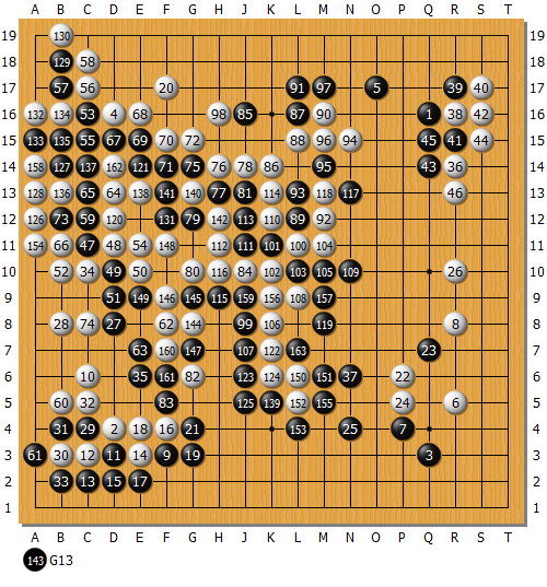 47的手法有些问题,被白棋简单一搬,感觉黑就不太好下了。本来的预期是48搬的时候黑52位搬然后59位长出,但仔细看了下,觉得白就算简单在137位守个角,黑的形状也不太对了。想了一会儿也只能在49位断一个寻求弃子。50打一个让我有点意外,其实白就简单在52位立下,黑50位长,白120位吃掉黑一子,这样定型黑局部就已经明显亏损,实战白棋反而给了黑战斗的机会。黑直接59位长出作战没有成算,于是先在53托角找找头绪。这里白正常的应对应该是56位搬,然后再把47一子吃掉。白棋54直接粘一个明显不太好,58也应该把47一子吃掉,实战被59长出一子,白棋的局势明显不对了。