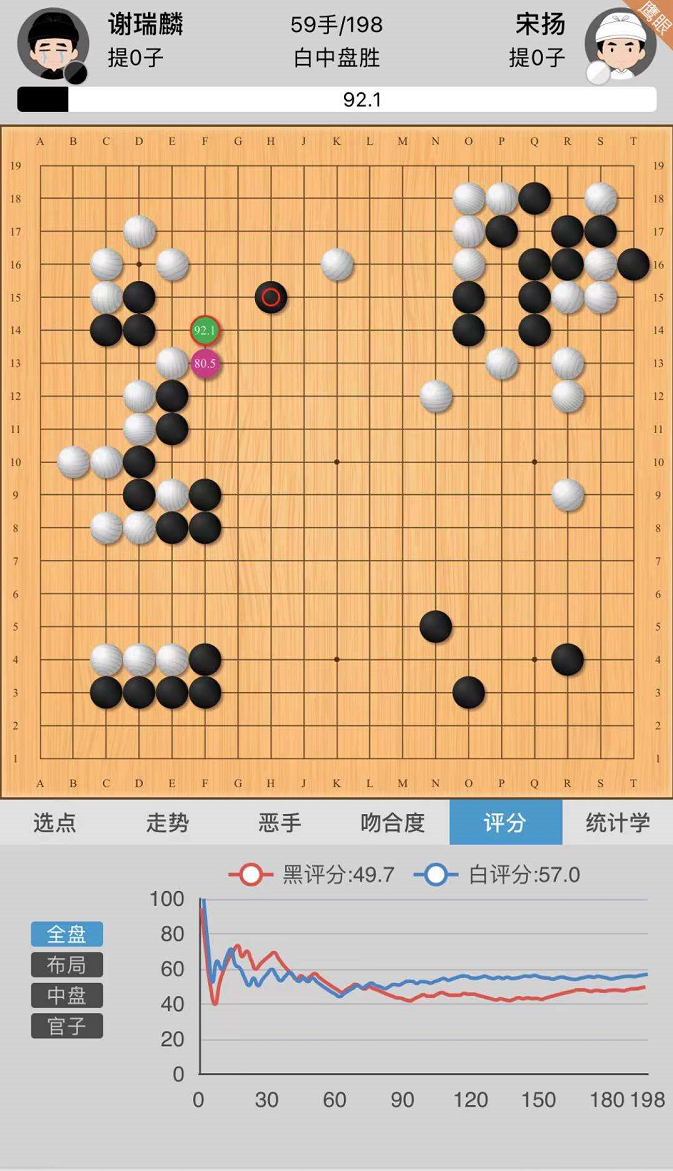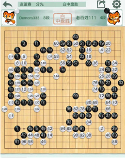 进行到80,黑棋先手把白的左边洗出,自己还成了一些空,白棋还多了块孤棋,这个局部下完,白棋机会应该就不大了。101以下太冲动了,黑此时只要把下方的大空围好,盘15左右的优势应该是有的。可能因为加了一天班,想要吃块棋释放一下不过局后看这么下的风险太大了,白的气比我想象得要长。好在运气比较好,最后对杀快了一口气,有惊无险地获得了最终的胜利。
