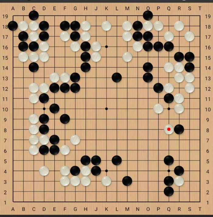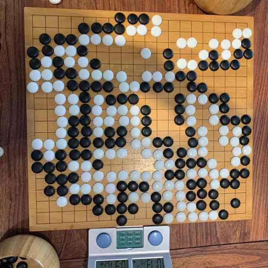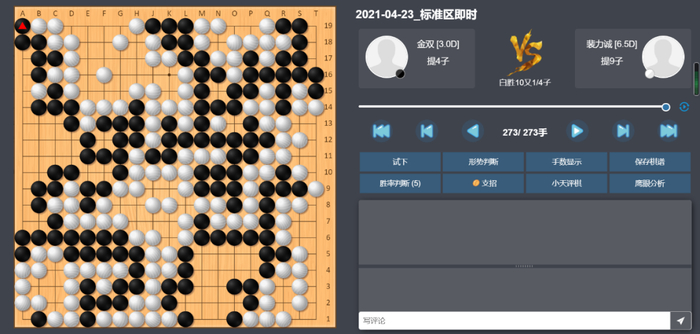 快棋台:开局右下角白棋就走错了,净活硬走成了个劫活。之后白棋布局下边,但是黑棋马上阻拦,遂转移右边,倒也两分。右上白棋弃子取势稍有便宜,但是白棋对于势力的掌握还不够强,所以黑棋侵入上边的时候没能把握好杀棋机会和要点,把自己杀崩了。之后虽有围中腹的拼搏,但实际上早已没有机会了。