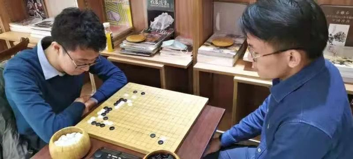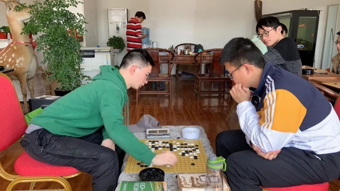 二三四台的比赛于4月5日上午在锦江之星10楼同时进行。率先结束的是第四台的比赛,我方队员不太适应快棋台时间,一个局部出现严重误算,被对手抓住机会后一路平推,早早签下了城下之盟。过了一会儿,第二台的王蓬睿在乱战当中敏锐地抓住了对手的弱点,拿下了这盘关键之战,证明了姜还是老的辣,比分变为2比1。