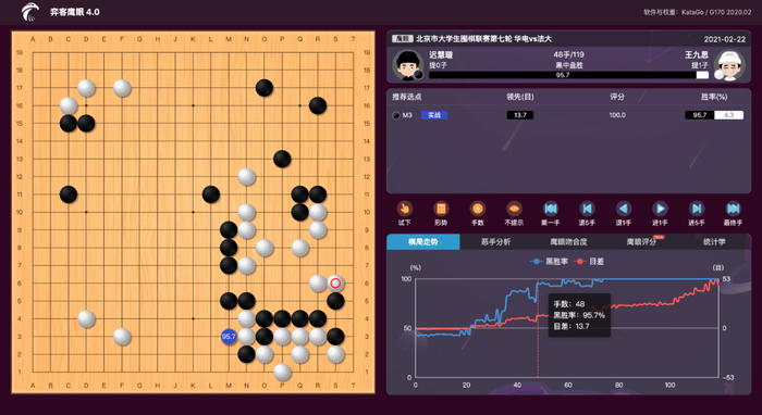 因学校的活动和两队队员的个人事务过于繁杂,因此第七轮北体民大联队对阵国际关系学院的比赛在两队领队的协商下移至五一期间。但因国关三台以及快棋台的同学临时有事,本轮仅有主将台和二台的比赛。主将战由北体李翰云执黑对阵国关王子毅。布局阶段黑棋通过深入的AI研究迅速取得优势,但由于优势意识过大连续下出缓手。白棋抓住机会逆转局面,并一路保持到小官子阶段。然而小官子白棋连续犯错,让黑棋侥幸捡得一盘胜利。白棋本盘发挥上佳,中盘星阵吻合度高达77,全局也达到67吻合度。可惜最终功亏一篑,遗憾落败。