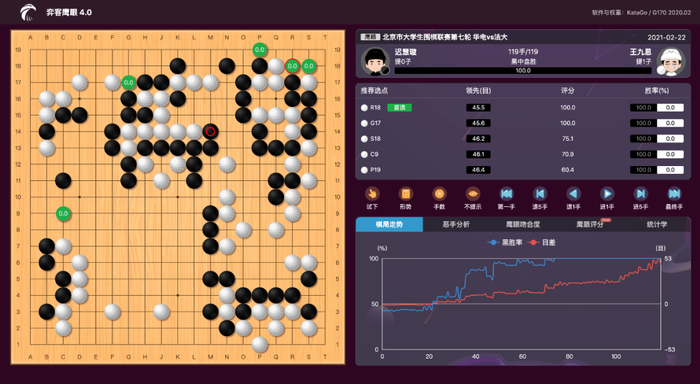 主将台我方执黑先行。开局右下角白棋的下法偏软,至第43手时,黑棋冷静豹吃两子,棋厚空多,胜率已经达到了95%。虽然后续白棋又进行了一些抵抗,但是黑棋的优势越来越大。最终,白棋还是选择了“玉碎”,终局119手。