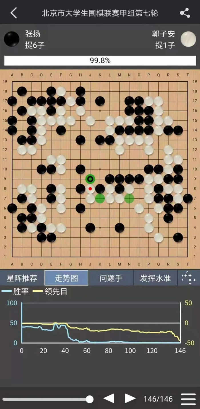 本场比赛我方北理工为主场。首先结束的是快棋台,我方棋手执白痛失好局,在99.5%胜率的情况下由于收官出现严重失误,最后以2.5目惜败于北师大选手。