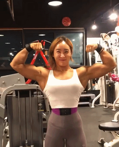 换上健身服的她,忽然间做出一副正展肱二头肌的动作与她一双月牙“笑眼”形成了巨大反差。