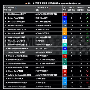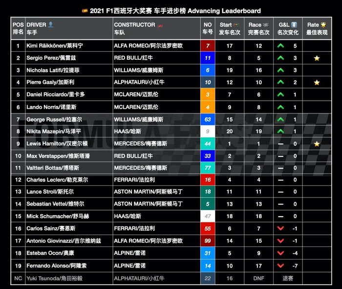 【F1】2021西班牙站 车手进步榜 Advancing Leaderboard©️
