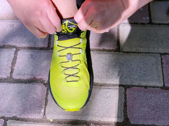 鞋带收纳系统,可将鞋带头完美收纳在具有弹性的LYCRA鞋舌里面,防止越野跑时在山中挂到树枝之类的障碍物而摔跤。
