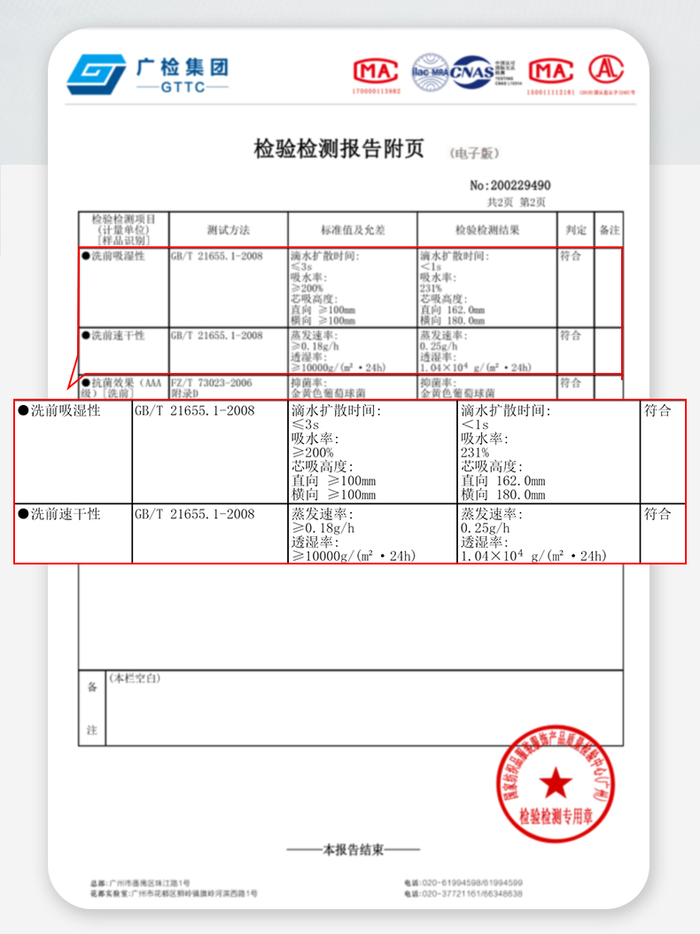 汗液扩散之后,有助于汗水被更快地向外界散发,有利于身体保持舒爽的状态。在“洗前吸湿性”和“洗前速干性”上,马孔多这条内裤都通过了第三方专业机构检测,达到了国家标准。