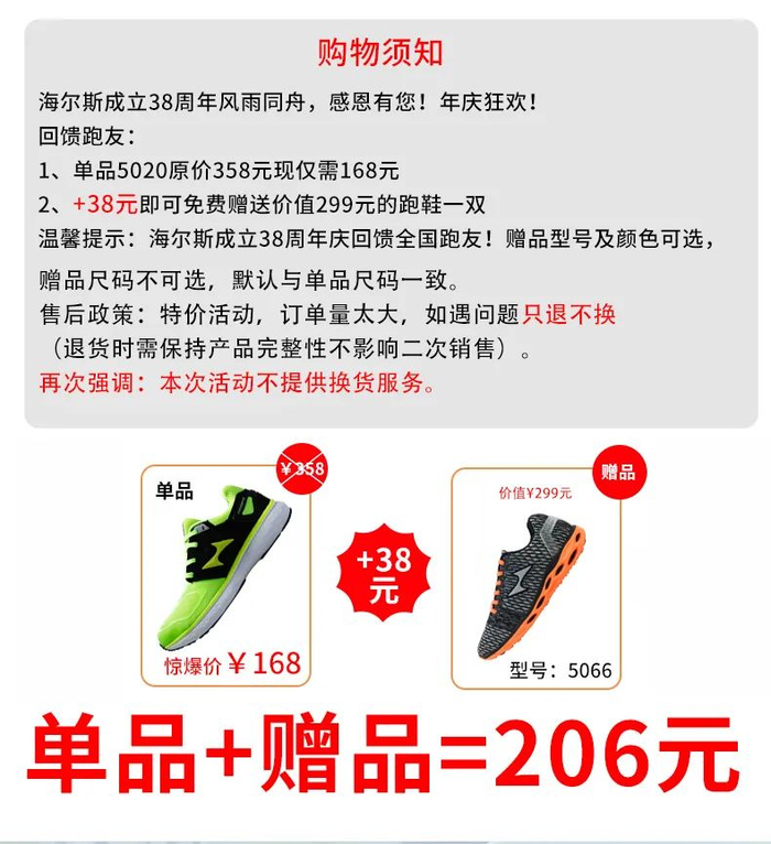 今天小编给大家带来超级福利!适逢海尔斯成立38周年庆促销活动,海尔斯5020型号跑鞋原价358元,活动价168元,再加38元即可获得5066跑鞋一双(价值299元)!