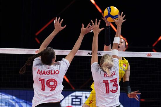 张常宁(右)在比赛中扣球。新华社 图