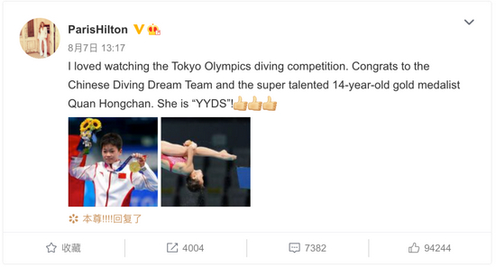 美国网红鼻祖,全球顶级名媛,希尔顿家族继承人之一帕里斯·希尔顿(Paris Hilton)在微博上祝贺中国跳水梦之队及14岁的天才金牌得主全红婵。