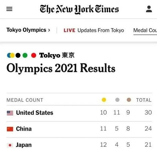 纽约时报的奖牌榜而实际上,虽然国际奥委会没有相关的硬性规定,但东京奥运会的官网就是按照金牌排序,法国队报这样的权威专业媒体也是按照金牌排序。
