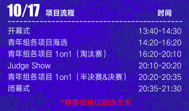 值得一提的是,本次比赛邀请了阿K、乔治、石头、肖智斌四位明星裁判助阵,届时四位嘉宾裁判还将在现场带来精彩的Judge Show表演。此外,席嘉琪、罗永胜、阿青、阿祺等诸位人气舞者也将现身赛场,更有明星MC、DJ惊喜加盟,数百位青年舞者将齐聚广州,通过Breaking 1on1、Locking 1on1、Popping 1on1、Hip hop 1on1四个舞种,决出各组优胜名次。