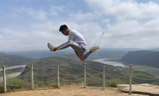 雷超是西安文理学院一名体教专业、跳绳专项的大四学生,同时是学校跳绳队队长。“大二的时候,看到学长在操场玩跳绳,觉得很酷炫,就跟着学长加入了跳绳队。”从此,他的生活和学习都离不开跳绳了。大三的时候,雷超确定了自己的专项——跳绳。比起计时计数类,雷超更喜欢花样,这似乎和学校更重视花样跳绳的培养有一定的关系。“可以这么说,我们学校花样的水平应该是西安花样跳绳的‘天花板’了。”雷超自信地笑着说。当被问到花样跳绳训练的技巧时,他说:“教练正确的指导占70%,毕竟都是他们宝贵的经验教学。还有就是,跳绳没有捷径,我经常一个花样动作会练上五百次以上,甚至上千遍。”