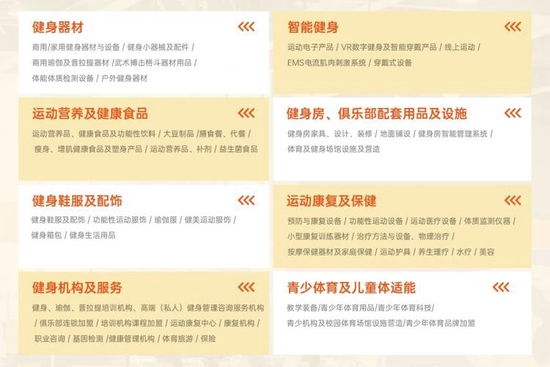 展区划分方面,2022 IFE重点围绕健身全产业链进行整合优化,完善各细分领域的布局和展示,细分八大展区。继续健身器材、运动营养、健身鞋服等展区的发展优势,丰富智能健身、健身房用品及配套设施、健身机构服务、运动康复及防护等展区,进一步挖掘产业上下游资源。在国家双减政策机遇下,着力强化青少体育特色展区,持续深化与中国体育用联合会学校体育工作委员会、广东省青少年体育联合会、广东省学生体育艺术联合会、中小学校、高等院校等组织的合作,引入更多青少体适能、体教融合资源。