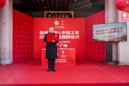 国家体育总局体育器材装备中心主任-孙为民先生向眉州东坡董事长王刚赠送合作信物《中国之家青花瓷盘》;