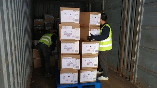 工作人员准备耐克捐赠的抗疫物资